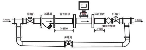 5、流量计应水平安装。建议在流量计后直管段后侧安装钢制伸缩器(补偿器),伸缩器必须符合管道设计的公称通径和公称压力的要求。伸缩器是作为管道应力的补偿及方便流量计的安装与拆卸。