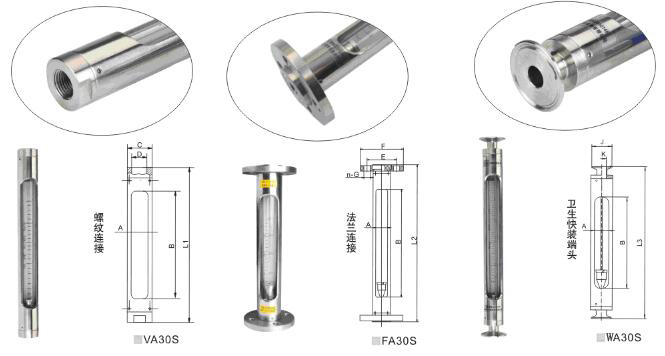 LZB-VA/WA/FA30S系列玻璃转子流量计为引进型不锈钢玻璃转子流量计,其外壳为不锈钢304材质,接口有内螺纹、活套法兰、卫生型快装接头三种规格连接新形式,产品轻巧美观适用。