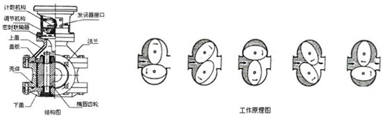 椭圆齿轮流量计由流量变送器和计数机构组成。变送器与计数机构之间加装散热器,则构成高温型流量计。送变器由装有一对椭圆齿轮转子的计量室和密封联轴器组成,计数机构则包含减速机构、调节机构、计数器、发讯器。计量室内由一对椭圆齿轮与盖板构成初月形空腔作为流量的计量单位。椭圆齿轮靠流量计进出口压力差推动而旋转,从而不断地将液体经初月形空腔计量后送到出口处,每转流过的液体是初月形空腔的四倍,由密封联轴器将椭圆齿轮转的总数以及旋转的快慢传递给计数机构或发讯器,便可知道通过管道中液体总量和瞬时流量。
