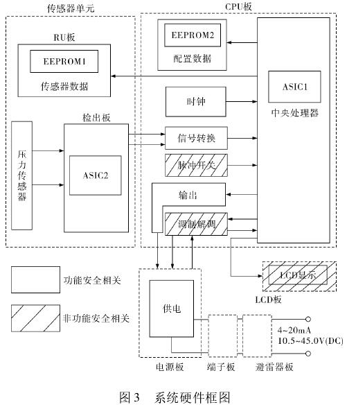 按硬件块划分,硬件部分由功能安全相关的硬件块和非功能安全相关的硬件块组成。其中,功能安全相关的硬件块包括传感器、传感器数据、供电、信号转换、时钟、配置数据、输出和中央处理器;非功能安全相关的硬件块包括脉冲开关、调制解调和LCD液晶显示。