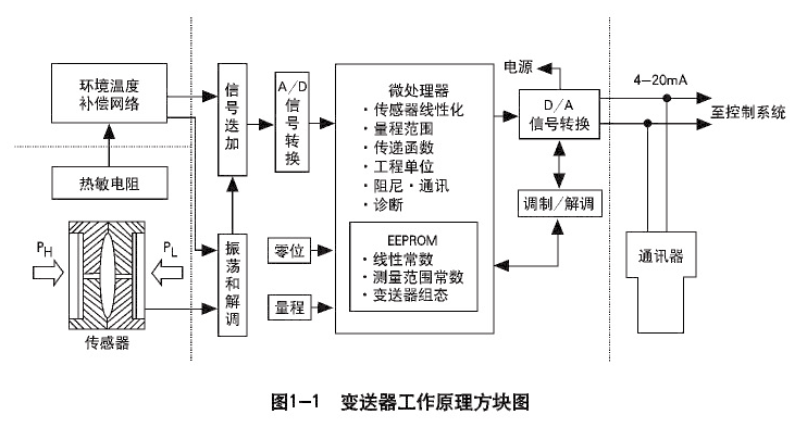 智能转换部件的功能是将传感器的信号经微处理器处理后,由D/A转换器转换成对应于测量信号的4~20mA模拟信号,此信号叠加在4~20mA模拟信号上,并和模拟信号一起传送出去。由于数字信号是以正弦波的形式出现的,数字的不同只是频率的差异,所以数字信号的平均值对4~20mA模拟信号不起影响。转换部件中的存储器是存放变送器输入输出关系及在组态过程中的各种信息,所以在实际应用中,差压变送器的是对节流装置的推力或在节流件前后形成的差压,根据流体流量与节流件前后差压平方根成正比,最终将差压信号开方运算后得到流量信号。