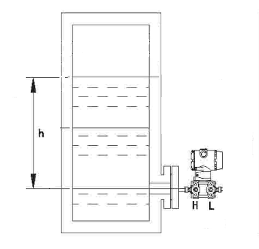 如图所示,高压室法兰与容器低端法兰相接,而低压室法兰安装在与高压室法兰同一水平线上的大气中。那么变送器量程为L=H·ρ