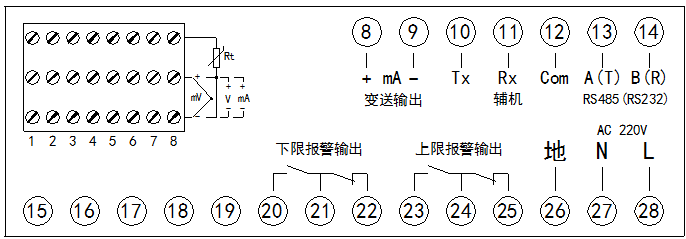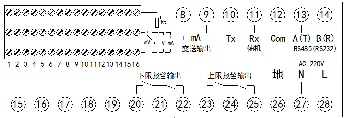 报警输出:(1)1-64通道统一上下限报警,继电器输出触点容量 AC220V/3A