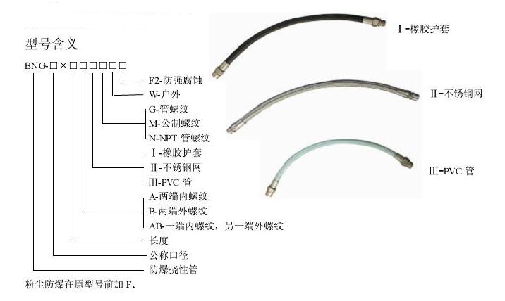 本防爆挠性管结构软管两端为金属螺纹活接头,管体部分分为金属软管,外层夹布优质橡胶和增强尼布软管护套以及夹层钢丝编织网管三种形式组成。本产品具有耐燃、耐油、耐腐蚀、耐水、耐磨、耐老化、挠性良好、结构牢固、工作可靠等优点。