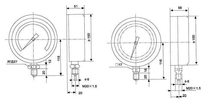 ○YB-150系列精密压力表温度影响:使用环境温度如偏离20±3℃(A型)或20±2℃(B型)时,则须考虑温度附加误差0.4%/10℃