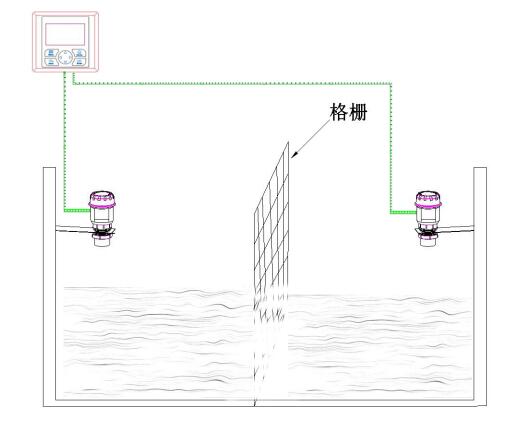 超声波液位计(传感器1、2)两部分组成,传感器不接触被测水溶液,仪表显示液位、液位差及工作状态。