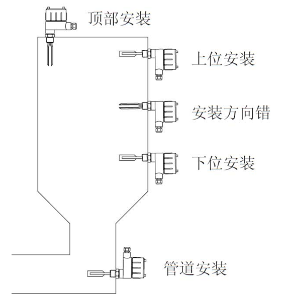 4、安装在卸料斗内:料位开关螺牙底端与桶壁之间的最大距离不超过60mm,可避免因物料的不当堆积而发生误报警的情况。